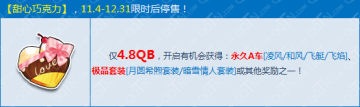 1月4日11点起-12月31日,仅需4.8Q币,在商城购买“甜心巧克力”即可获得,开启可以获得奖励,有永久A车[凌风/和风/飞艇/飞焰]、极品套装[月圆希煦套装/暗雪情人套装]或其他奖励之一。