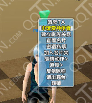 + 拥有并携带了爱神小天使的玩家在3D场景下,右击一名其他玩家的形象后,点击“申请爱神使者”按钮即可向对方发起申请(情侣双方都可申请);