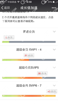 3、大家可以很明显的看到wap端的QQ会员官网已经把成长值直接写出来了,SVIP6-7 40点/天,而无需参加任何活动提速。