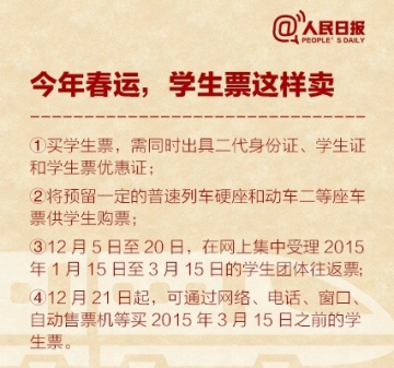 12月5日至20日,在网上集中受理2015年1月15日至3月15日的学生团体往返票;