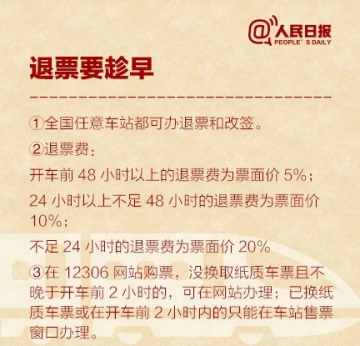 票面乘车站开车前48小时以上的,退票时收取票价5%的退票费;开车前24小时以上、不足48小时的,退票时收取票价10%的退票费;开车前不足24小时的,退票时收取票价20%退票费。