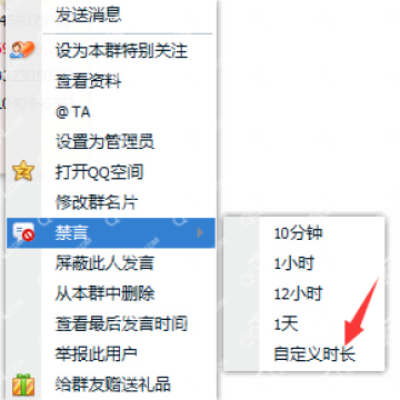 而且在QQ群禁言当中发现了自定义时长,也就是说,想禁言群员多久就禁言多久呢!