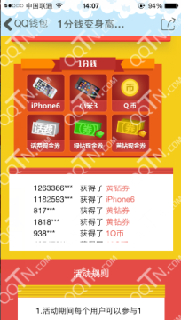 QQ钱包1分钱变身高富帅活动,支付1分钱即可100%抽取,抽取Q币、绿钻券、黄钻券、话费券、小米3以及iphone6。