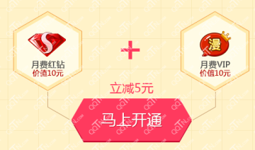 活动期间,用户可在本页面15Q币开通一个月红钻+动漫VIP,立减5元。