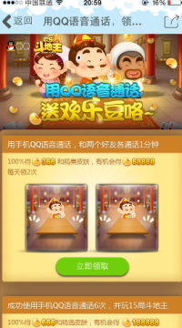 2、每天使用手机QQ语音通话,和两个好友分别通话一分钟,即可抽奖一次,100%得366欢乐豆+闲情逸致皮肤(10天),并有机会额外获得68888欢乐豆。每天可领两次,两次的好友必须是不同的。