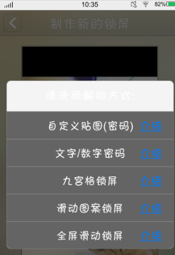 4、纹字锁屏一共有五中解锁方式,新手可以点击右边的介绍查看效果和教程,那些伤感非主流的文字控都可以用文字数字密码来制作,这里我就选择第一种自定义贴图啦