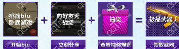 完成biu卧底挑战后,分享到朋友圈/微信/手Q,立刻获得抽奖机会,极品武器马上拥有!不停刷新战绩,biu掉的卧底越多,得奖机会越大哦!