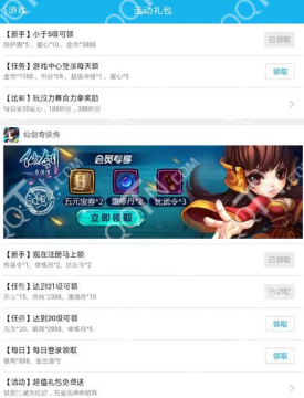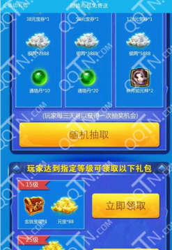 1、qq用户专属大礼:黄金礼包、钻石礼包、至尊礼包、每三天可以随机抽取一次