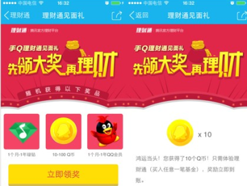 手机QQ理财通见面礼 先颁大奖再理财免费获得10Q币