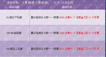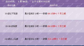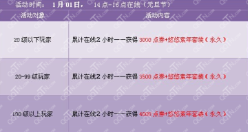 1月1日当天,所有在14:00-16:00期间连续在线的玩家都能够获得4000点券和一套永久“悠悠素年套装”作为新年礼物。1月2日、3日两天14:00-16:00期间连续在线两小时,玩家能够获得2000点券和1个紫金刀、一个芒果的奖励。1月4日全天任意时刻完成连续在线2小时任务还能拿到1000点券和1个月之钥,4天9000点券轻松获得,小橘子和你一起迎新年。
