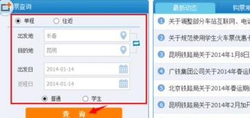 4、登陆后,在车票查询中选择出发地、目的地、出发时间、单程/返程等信息后点击“查询”按钮。