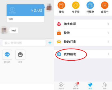 支付宝钱包8.5版本的内测截图显示,“探索”这个二级页面下出现了一个“我的朋友”的选项。进入转账界面后也能够直接发送语音、文字信息和表情。之前这个界面必须在转账的同时才能发送进入转账界面后留言。