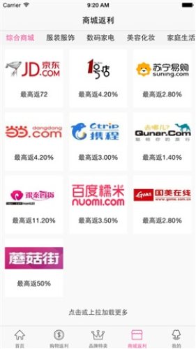 【商城返利】:提供供包括拍拍,京东商城,亚马逊(卓越网),国美电器,唯品会,苏宁易购,当当网,美团网,聚尚网等网上数百家商城购物返利,折扣服务!
