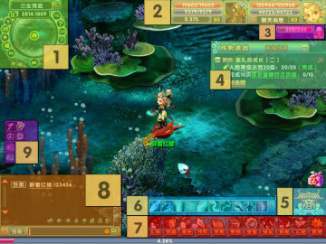 为了方便大家参考,我们将游戏窗口中的功能区划分为9个部分,如下图: