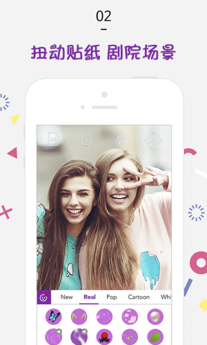 拍摄过程中的自动美颜功能,不需要您进行任何后期p图即可录制的像明星一般精致无暇,免费提供各种贴纸,场景,可单个或多个同时使用,让您的日常丰富多彩,我们的贴纸和场景会随时更新哦,这不仅是一款相机,更是一个游戏,快来加入吧~