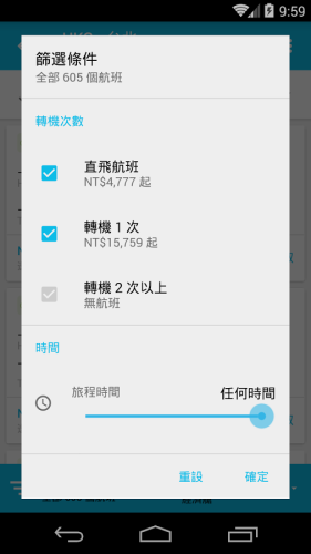 依票价、客舱等级、航空公司以及起飞和降落时间来进行筛选