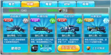 这里看到是当前游戏内存在的枪械,购买原则跟角色一样,枪械可以通过游戏签到得到、军衔达到一定等级购买、钻石购买、使用碎片兑换;