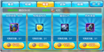 商城有角色、枪械、魔窟、战队、极限五个类型的道具出售;