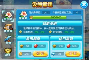 设施管理主要的功能是对花卉房、炼金坊、矿场和副本(暂未开放)这四个建筑进行捐献,提高建筑的等级,等级提高后,会提升建筑产出的资源哦;捐献得到的战队币相当于战队经验;
