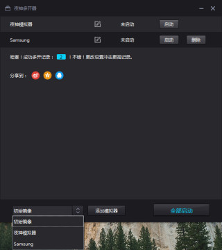 初始镜像选项为打开一个全新的模拟器,里面没有上一个模拟器安装的任何软件,下面的选项samsung就是多开一个跟samsung安装一样应用的模拟器,相当于复制上一个模拟器。