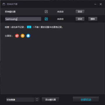其中启动按钮为启动模拟器功能,删除按钮为删除模拟器及模拟器中所有数据功能,请大家删除时一定要备份好自己的数据。