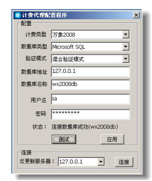 安装完成后通过桌面快捷方式“云更新计费代理配置程序”打开计费代理配置界面,设置好数据库连接参数后,点击应用按钮保存数据库配置,然后选择云更新服务器IP,连接成功后,可以退出配置程序,计费代理将以服务模式在后台自动运行。