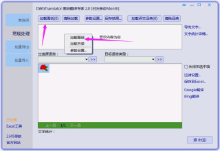V2.0版本支持“批量导出”“批量导入”功能,高速全自动处理您的图纸翻译业务。百 千张图纸,通过手工或者其他工具提取写文字可能需要 大量时间,而利用本软件仅需要十几分钟的时间就 全自动完成。