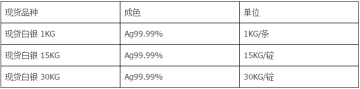 符合中国白银标准 GB/4135-2002,经交易中心认定方可用于交收;会员保证一定现货存量并承诺对售出银锭(条)进行回购。