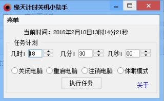 缘天计时关机小助手是一款免费绿色小巧的电脑定时关机软件,这款软件可以帮助用户设置时间定时关机,缘天计时关机小助手帮您完成愿望,该软件能够智能设置时间,自动关机,让您的电脑在无人照看的情况下载自动关机。软件操作简单,欢迎有需要的朋友免费下载使用!