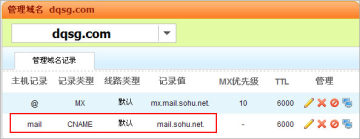 2、如您需要使用独立的企业邮箱登陆页面,即[mail.域名]形式访问,则需进行如下CNAME设置:(以dqsg.com域为例)