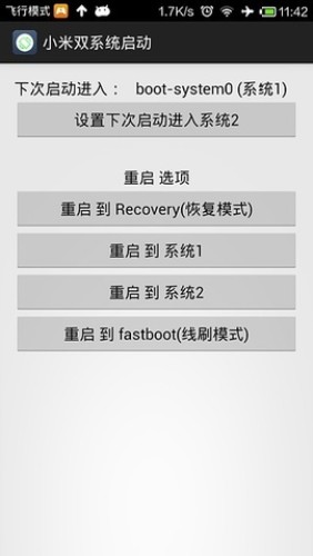 小米双系统切换软件是专为小米用户打造,用户可以借助这款App,实现双系统切换和启动功能。本软件使用方便简单,可以让更多人体验双系统带来的便利。同时还可以设置重启为恢复模式、线刷模式、系统1、系统2等多种选项。让你轻松玩转双系统。