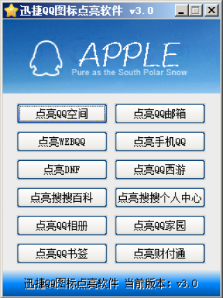 迅捷QQ图标点亮软件是一款专为QQ用户制作的快速点亮QQ图标软件,这款软件能够帮助你快速点亮QQ空间、QQ邮箱、WEBQQ、手机QQ、搜搜百科、搜搜个人中心、QQ相册、QQ家园、QQ书签、财付通等图标,如果你是一个QQ图标党欢迎使用这款迅捷QQ图标点亮软件!
