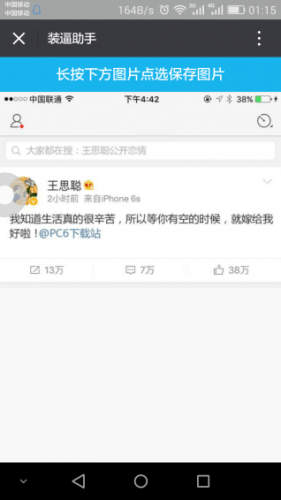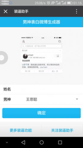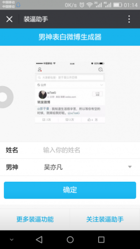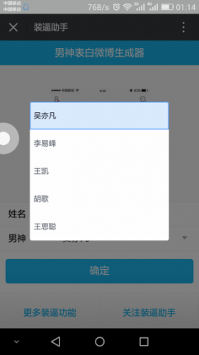 男神微博表白图生成器,有胡歌、王思聪、吴亦、李易峰、王凯等五位明星/名人共大家选择,让他们在微博上向你表白,生成后可发送到朋友圈任小伙伴们围观哦。