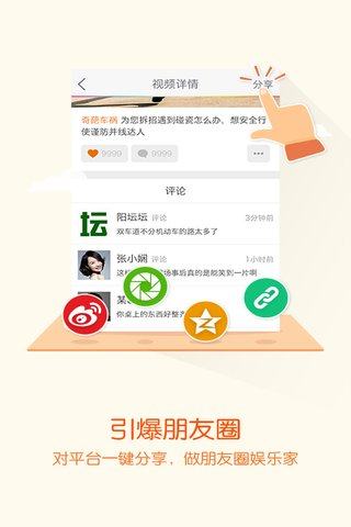 一键分享:视频仅需一步就可将视频上传至网络,发布到新浪微博、QQ空间、微信朋友圈也只需要轻轻一点。传播就这么简单。
