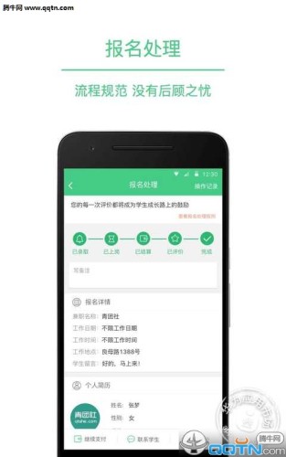 在这里,能够更清晰的浏览学生兼职简历、历史兼职、历史评价,一键查看、一键录取。