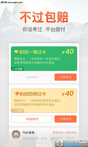 4) 学车保过,不过包赔:通过平台报名的学员,即可免费获得不过包赔资格。
