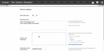4.Vimium插件还针对不同的用户提供了个性化的设置功能,用户只需要点击Chrome上的Vimium插件按钮启动配置界面即可配置自己常用的Vimium插件的操作方式,如图所示: