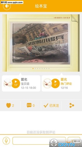 绘本宝是一款可以看绘本的app。小伙伴们可以将自己画的绘本上传到我们的app上(每张图片都是可以录音呦)与其他小伙伴分享。您还可以选择观看其他小伙伴们上传的有声绘本,睡前必备啊 小伙儿!!!!!!!