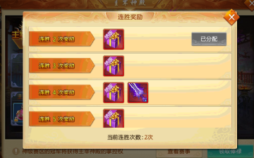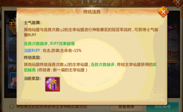 如果一个仙盟连胜了很多次,为了避免出现垄断局面,那么在神级赛区决赛时,对与其进行决赛的队伍是有BUFF加成的,且主宰神殿仙盟连胜次数越多,BUFF效果越强。