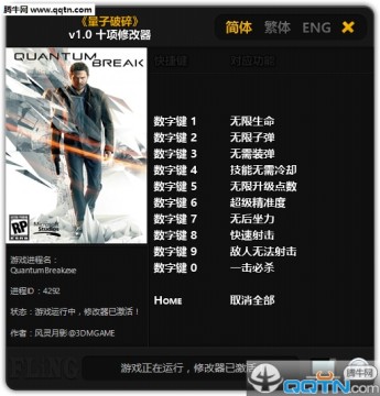 量子破碎PC修改器由风灵月影制作,提供了无限生命、无限子弹、一击必杀等共项修改功能,支持简体、繁体中文以及英文,欢迎玩家免费到腾牛网下载使用。
