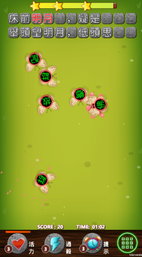 --游戏画面中,每一个空格都是要玩家填入一个字,这些字会由各种样式的蝴蝶带出来,在画面中飞舞。当玩家看到可以填入空格的字时,点选该蝴蝶就完成了该空格的填字。
