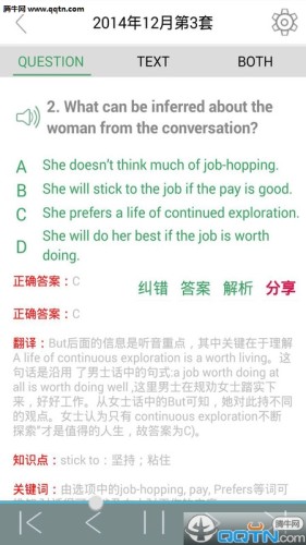 每项均含有题目选项、音频、听力原文并提供的权威详解,给你最真实的考场体验。