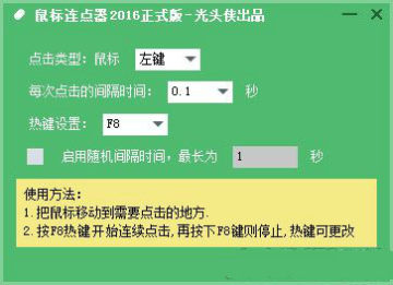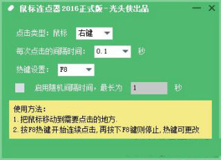 首先选择鼠标的点击类型即鼠标左键或是右键,根据需要设置点击的间隔时间,然后设置热键默认为F8,按下F8键软件开始运行,再按一次则结束运行。
