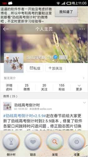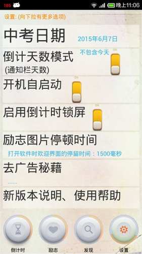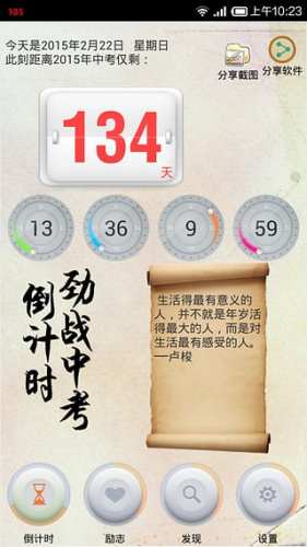 劲战中考倒计时是一个专为准中考同学设计的软件,拥有许多独家实用功能:锁屏倒计时、桌面插件、励志图片、名言警句素材展示、分享截图、微博分享学习经验、手机左上角状态栏显示倒计天数等,有漂亮的倒计时分秒表,精确到秒,估算到0.01秒。可自已设定中考日期年月日。祝各位学习顺利,劲战中考,争分,惜秒!