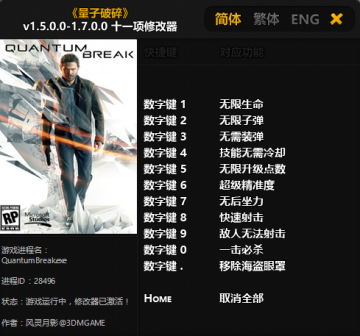 量子破碎v1.5.0.0-1.7.0.0十一项修改器是pc游戏量子破碎的一款修改器软件,修改器适合游戏1.5.0.0-1.7.0.0版本,有十一项修改功能,喜欢的朋友欢迎下载使用。