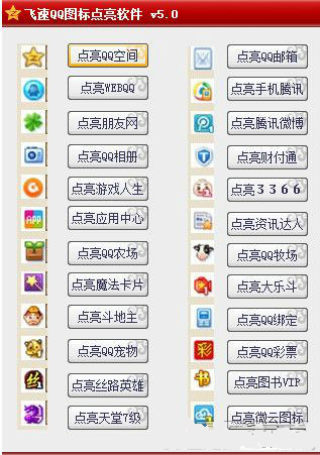 飞速QQ图标点亮软件是一款可以帮助QQ用户轻松点亮QQ图标的辅助工具,该QQ图标点亮器在面板上汇集了大量QQ图标业务,只需用户点击进去,跟着显示的步骤一步步下去,就可以点亮大多数图标,还等什么呢,赶快试试飞速QQ图标点亮软件吧。