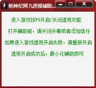 进入游戏按F9开启/关闭透视功能,打开辅助前,请关闭杀毒软件。