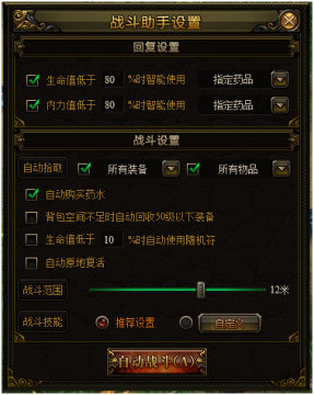 在挂机设置中,您可以对自动吃药、自动拾取、挂机范围等进行设定。
