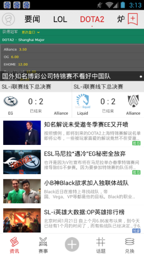 《大电竞app》是一款以电子竞技信息为平台的资源聚合地,在这里您将会看到大量的电竞相关的新闻、活动和交流讯息,让您紧跟电竞发展的步伐,做一个合格的“电竞人”。各大游戏的比赛更新讯息我们都将为您展示在这里,赶快下载了解吧!