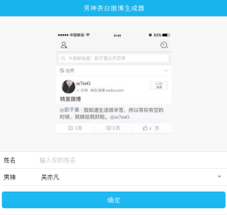 男神表白微博图片生成器可以帮助大家制作一张明星微博表白的图片,在5.20这个特别的日子里,大家可以在朋友圈里扔一张这样的图片来压压惊也是非常不错的!
